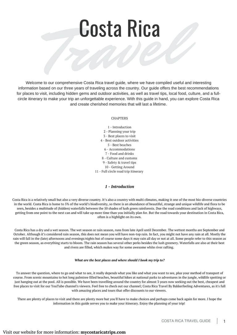Welcome to our comprehensive Costa Rica travel guide, where we have compiled useful and interesting information based on our three years of traveling across the country. Our guide offers the best recommendations for places to visit divided into chapters over 37 pages, including hidden gems and outdoor activities, as well as travel tips, local food and culture, to make your trip an unforgettable experience. With this guide in hand, you can explore Costa Rica and create cherished memories that will last a lifetime.
